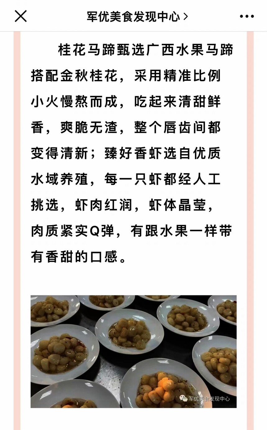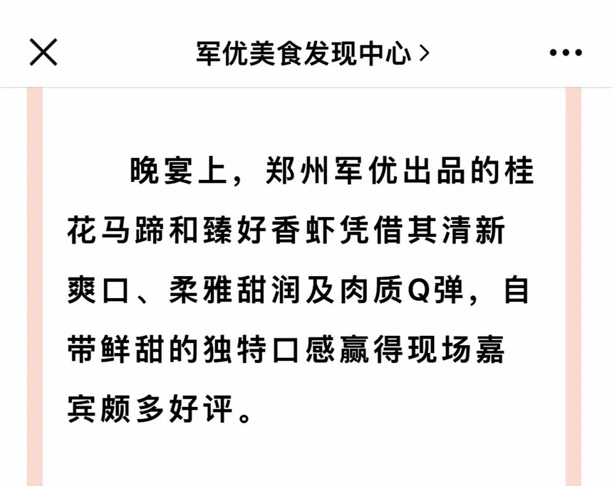 慈善晚宴上,郑州军优携金福地桂花马蹄,凭借其清新爽口、柔雅甜润的口感,赢得现场嘉宾颇多好评。金福地桂花马蹄甄选广西水果马蹄搭配金秋桂花,采用精准比例小火慢熬而成,吃起来清甜鲜香、爽脆无渣,整个唇齿间都变得清新。